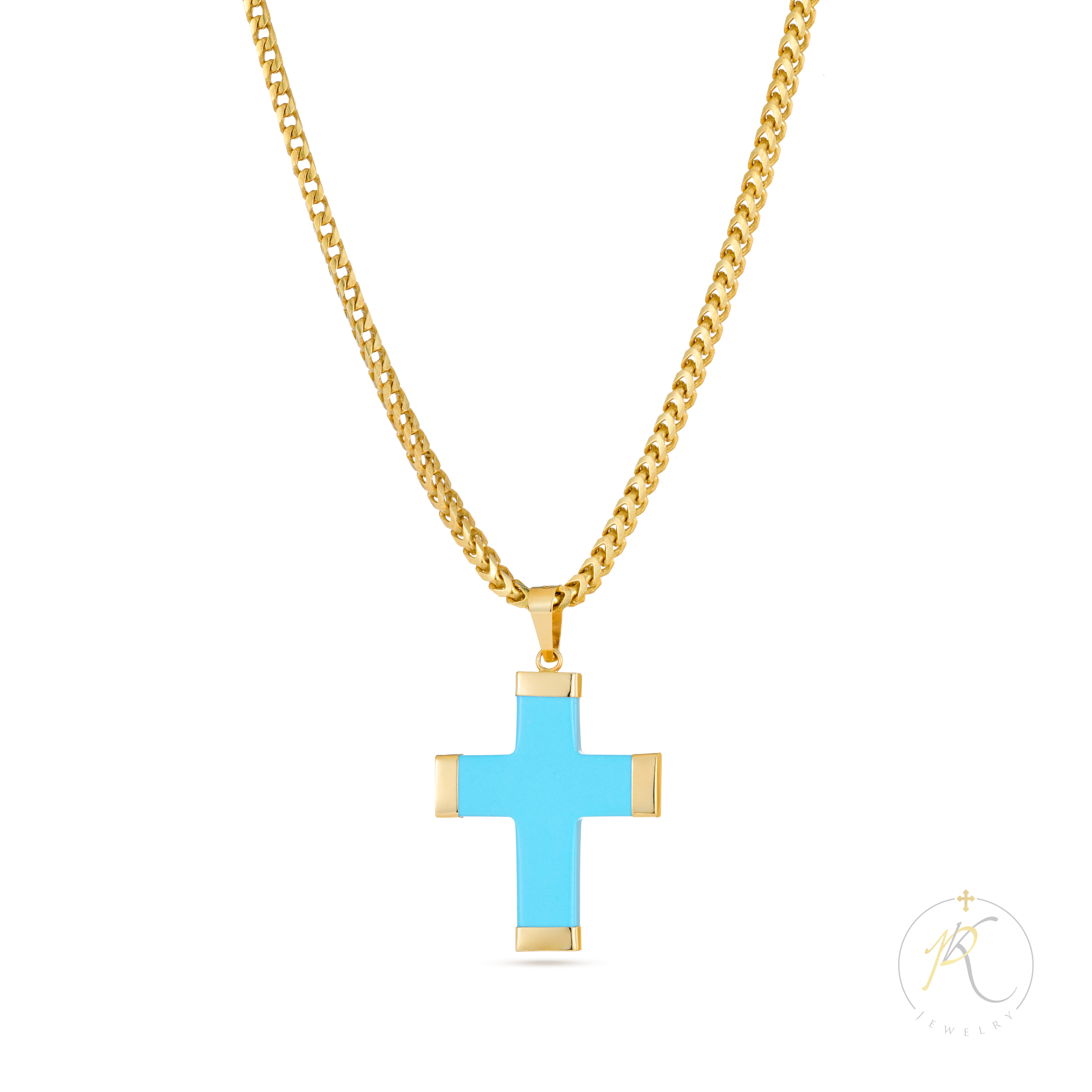 CHAIN: 22” 925 Gold Plated Silver Chain $58.00 CROSS: 14K Cross & Turquoise(pressed semi-precious) Approximately: 1/2”X1”