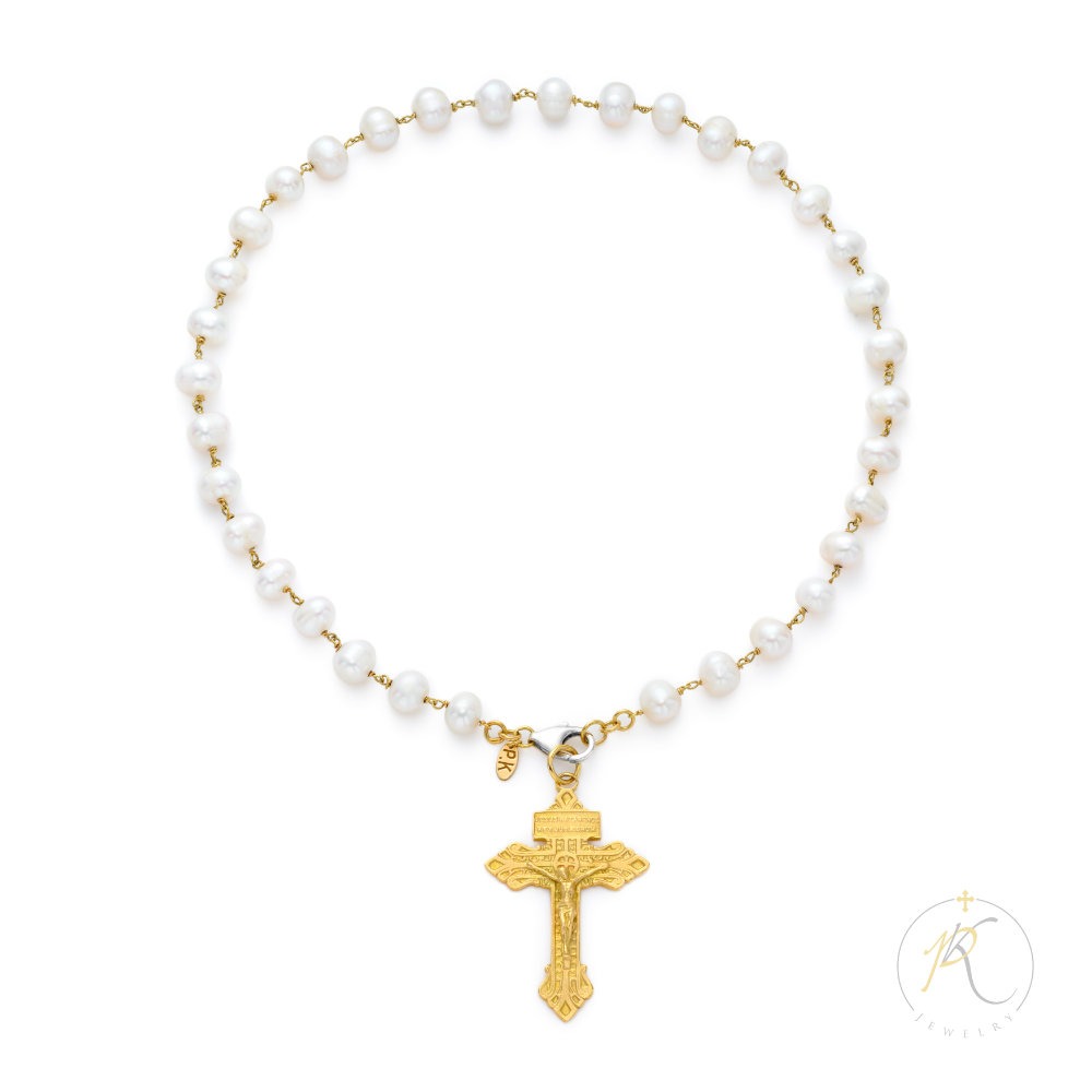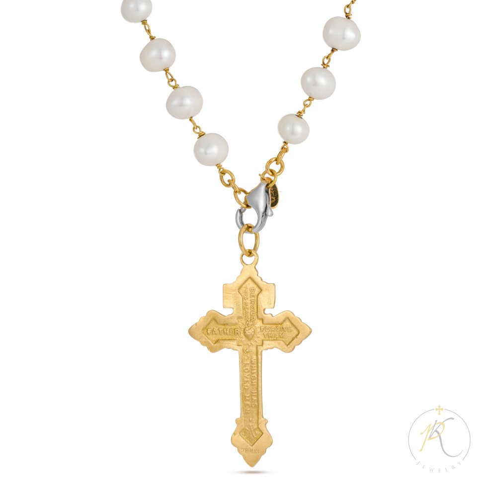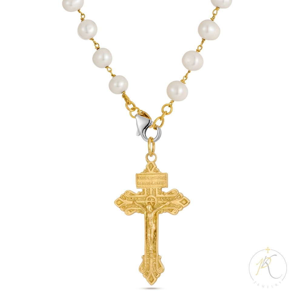 18K Gold & Fresh Water Pearls Necklace – Cross – 925 Silver Clasp