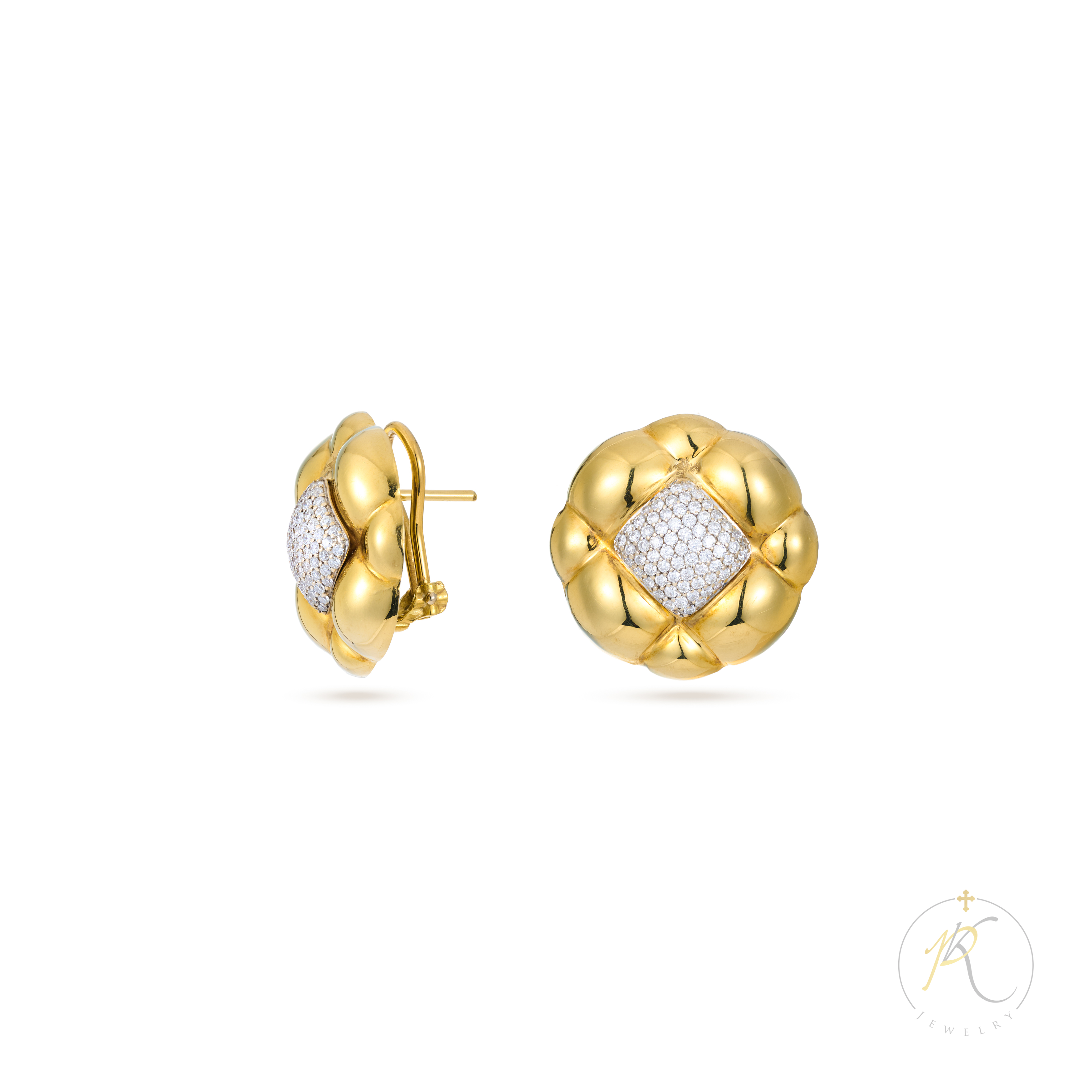 18K Vintage Flower Look Round Clip Earrings & Pave’ Diamonds